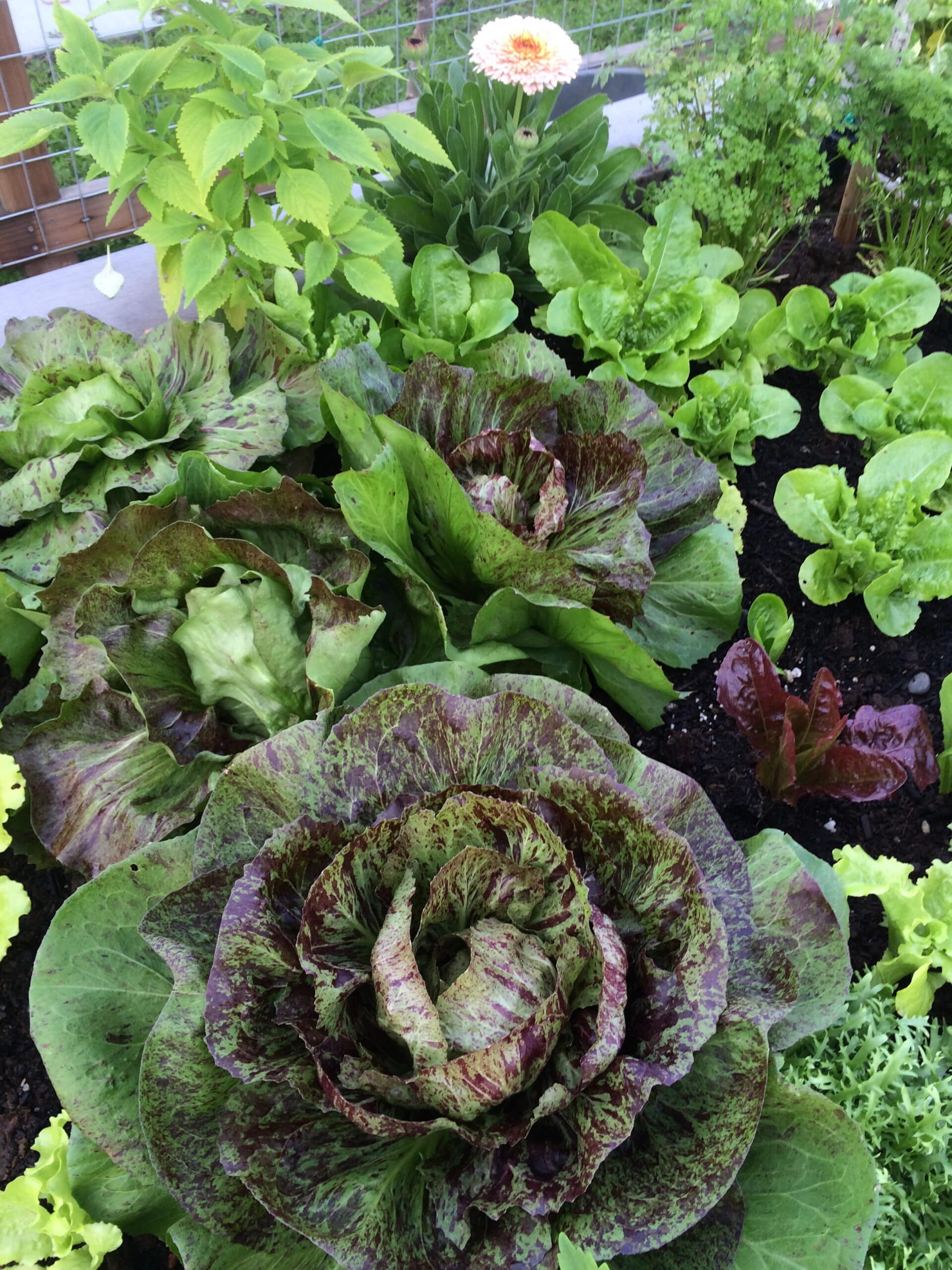 It may surprise you that there are lots of vegetables and herbs that love this colder, wetter weather. In the picture above, you’ll see some big, beautiful heads of speckled radicchio, frilly green frisee, tender red and green lettuces, hearty romaines, pretty strawberry blonde calendula (the petals are edible!), chervil (parsley’s mild flavored cousin), and a Vietnamese herb called Kinh Gioi or Vietnamese Balm. Kinh Gioi is an incredible herb that everyone should try – it has a lemon flavor that’s great for teas, but also compliments soups and chicken dishes.