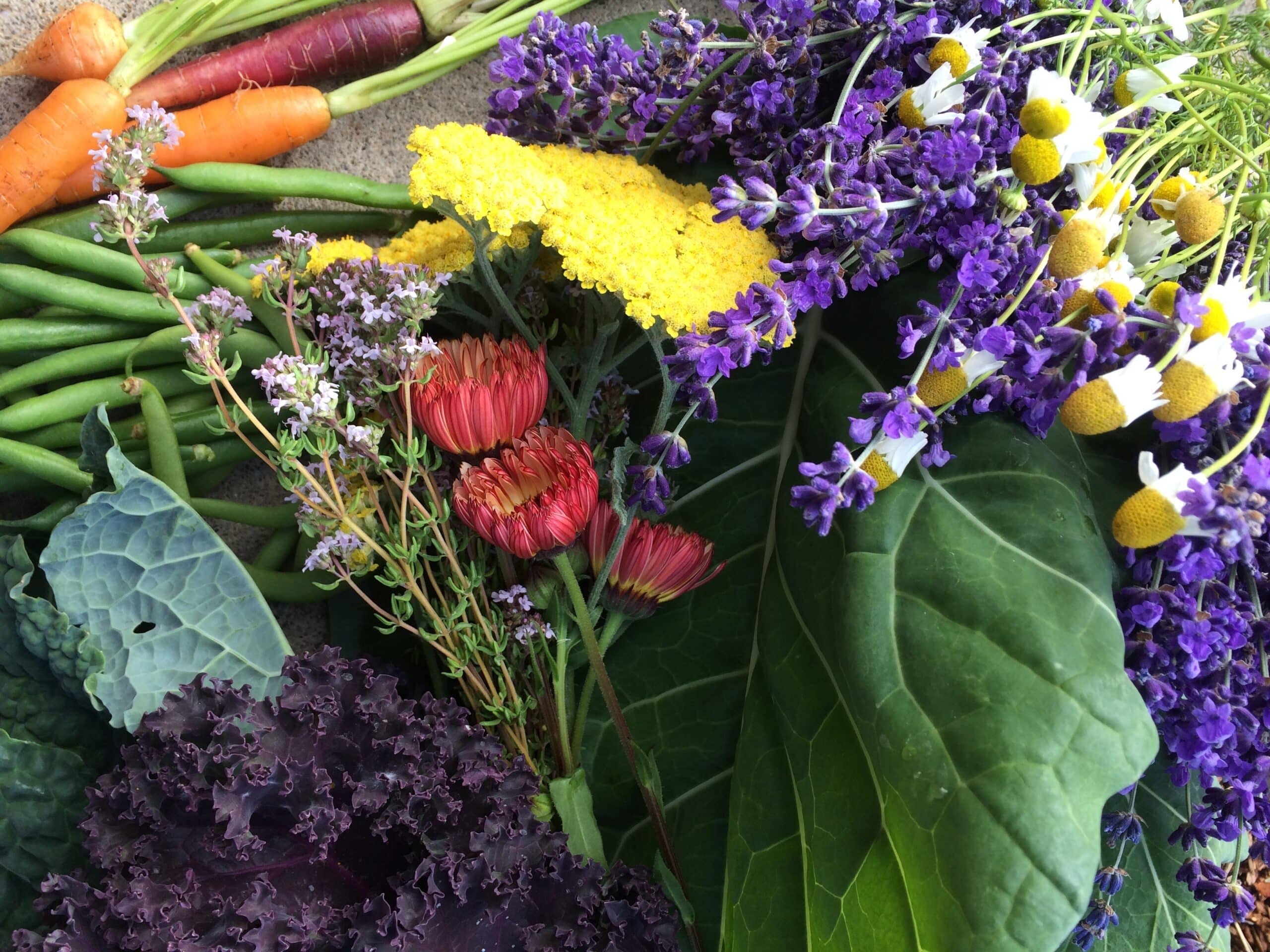 Thanks to everyone to came to this month’s DIG IT class about edible flowers! We had a great turnout and we talked about edible flowers of all shapes, sizes, and colors, including the lavender, yarrow, chamomile, calendula, and thyme blossoms that you see in the picture above. We did a lot of taste testing of freshly cut flowers, but some favorites were borage, anise hyssop, nasturtium, and flowering basil varieties such as Wild Magic and African Blue. Don’t worry if you missed the class, though, as we’ve got you covered with a few tips on how to impress your friends and use some tasty edible flowers in the kitchen!