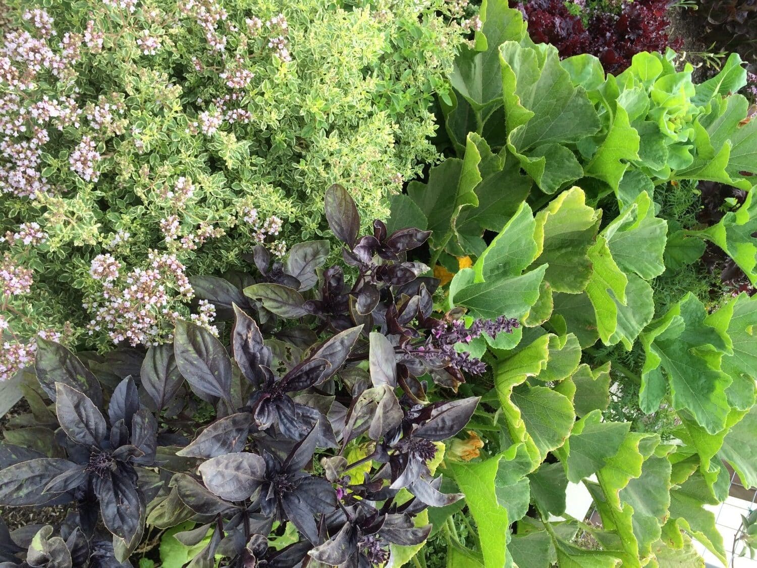 3) July Plantings: July is a bit of an “in-between” month when it comes to vegetable plantings, but feel free to try some late season beans and summer squash (the latter pictured below, with some purple basil and flowering variegated oregano). You can also direct seed some of our favorite root vegetables, including beets, carrots, and radishes. If you live in a cooler micro-climate or have a spot in your garden that isn’t in full-sun and mid-day scorching heat, you can also plant some leafy greens such as lettuce, spinach, kale, and swiss chard. Keep an eye on them, though, as they can bolt and go to seed quickly at this time of year!