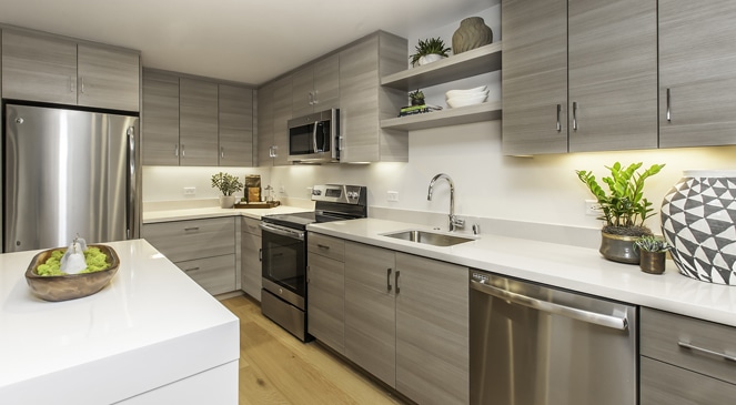 The Quimby apartment collection model most speaks to our personal design sensibility. We love to incorporate soft textiles, cool and soothing colors, and natural finishes into our designs. The spa-like, restful color scheme is a pleasure to work with.