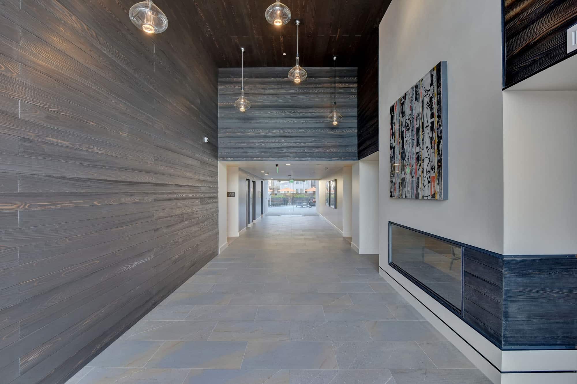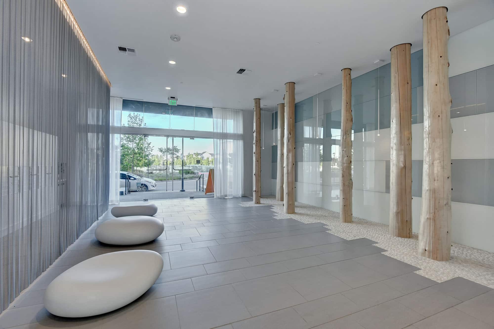 We think the tenants will really enjoy the unique design of the Quimby lobby. Instead of a traditional arrangement of furniture, the lobby was designed as an art installation evoking the tranquility of nature. As you enter the lobby, there are natural tree trunk columns growing out of a bed of white gravel. In between the columns are slender pin-point lights that hang from the ceiling, and the wall is covered in light colored glass panels to represent a gentle sky. On the opposite side of the lobby, there is a delicate and shimmery steel curtain that gracefully moves as people walk past, to represent rain. Finally, there are large scale stone stools for tenants to take a minute to rest on while enjoying views of the lobby and the park outside. This is truly a unique lobby and an interactive experience for tenants of Quimby.