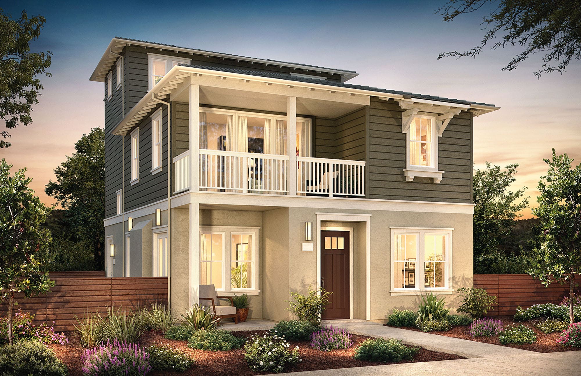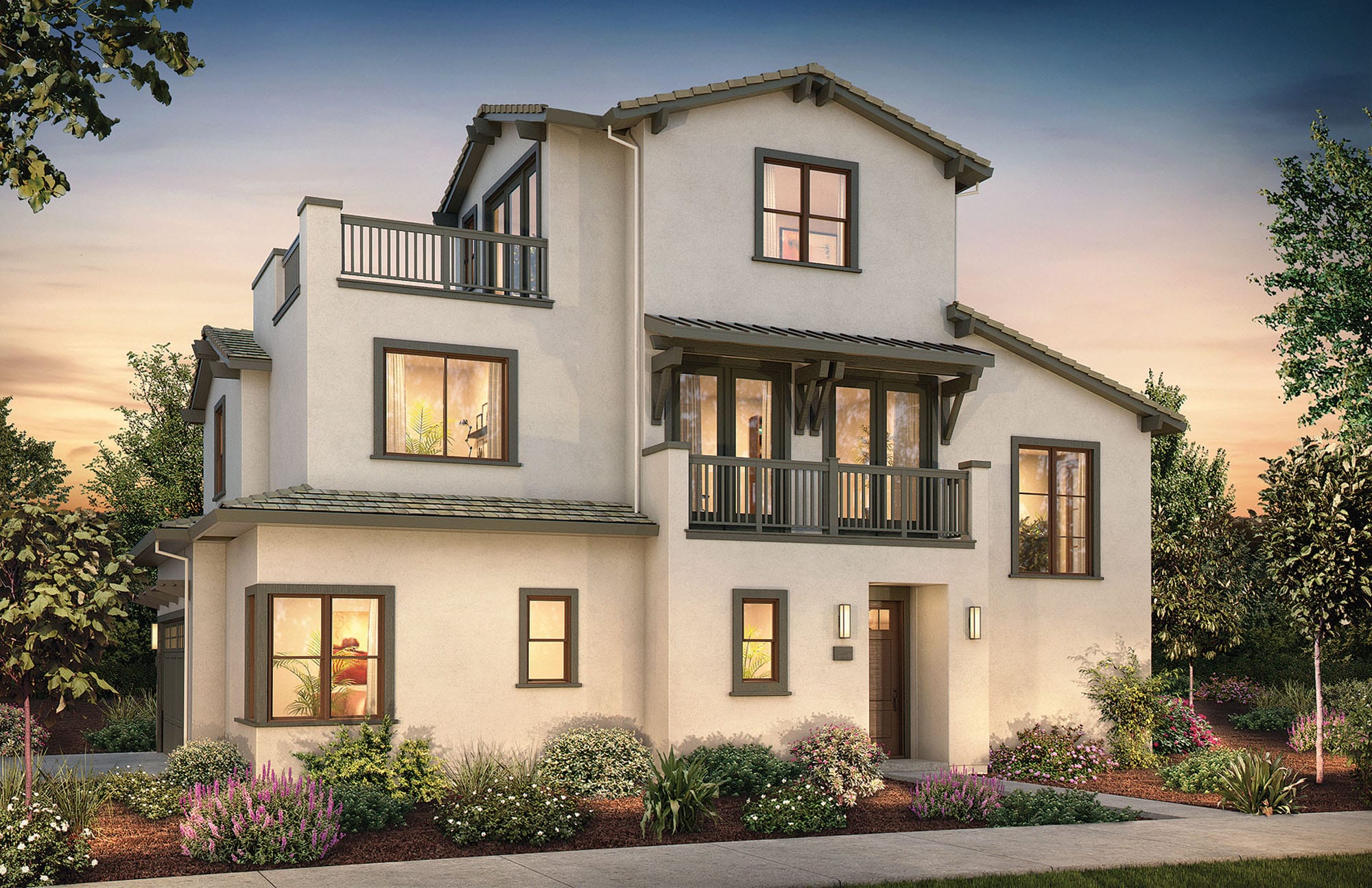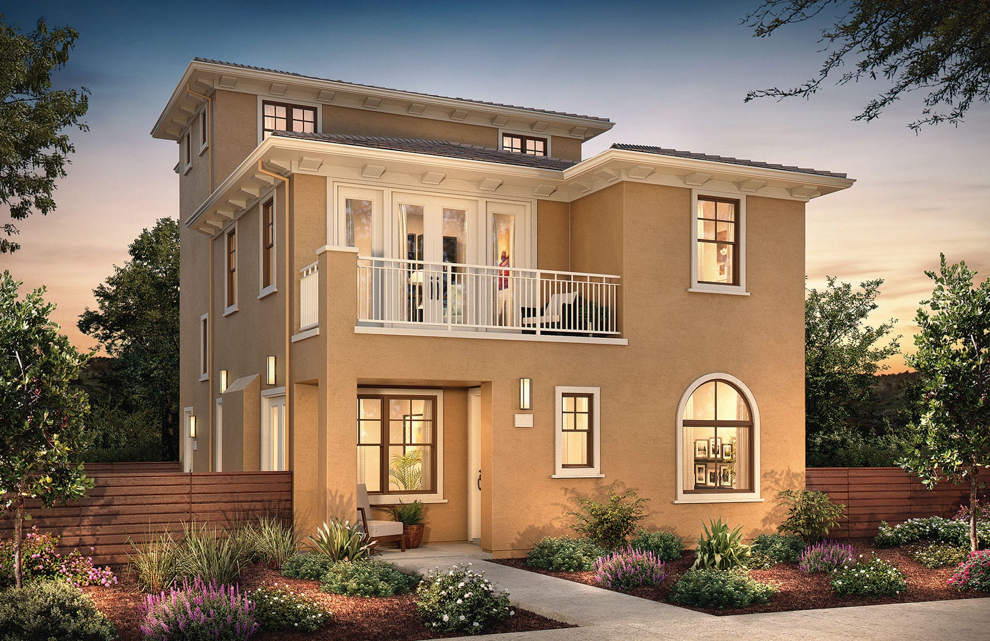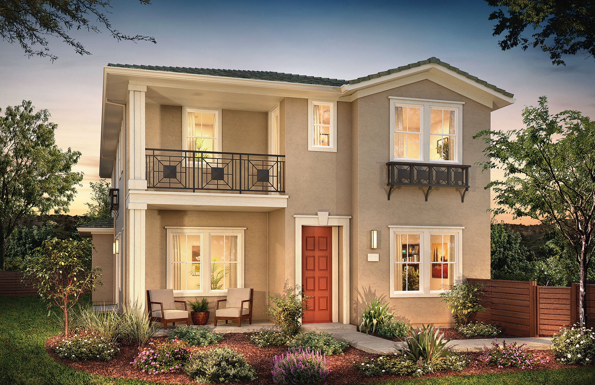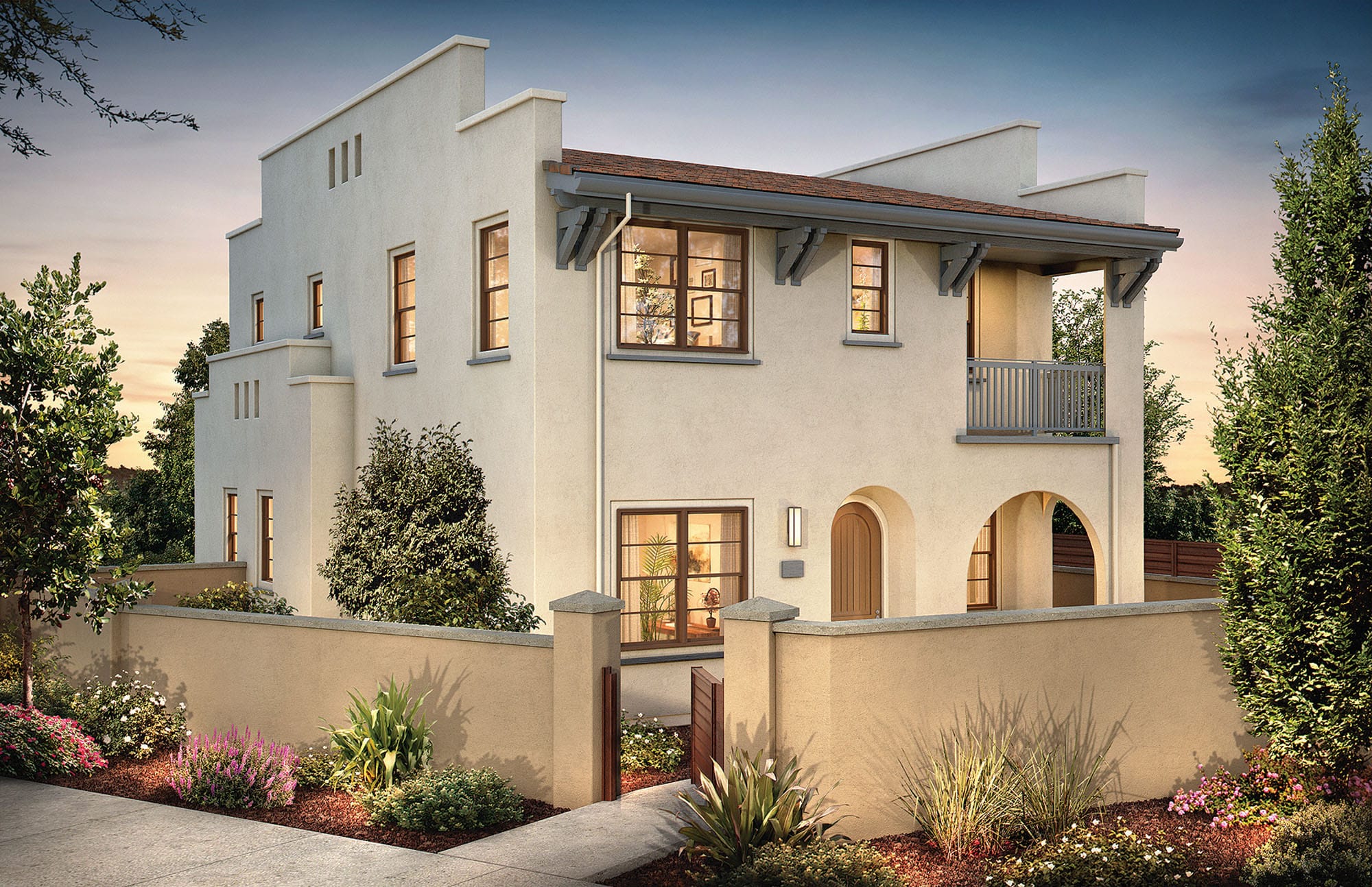 These homes are featured along the southerly paseo and offer a striking mix of formal and traditional details that stand apart. With balconies that feature distinctive railings and potshelves in metal with a formal geometric design, these homes offer stucco facades and simple traditional details.