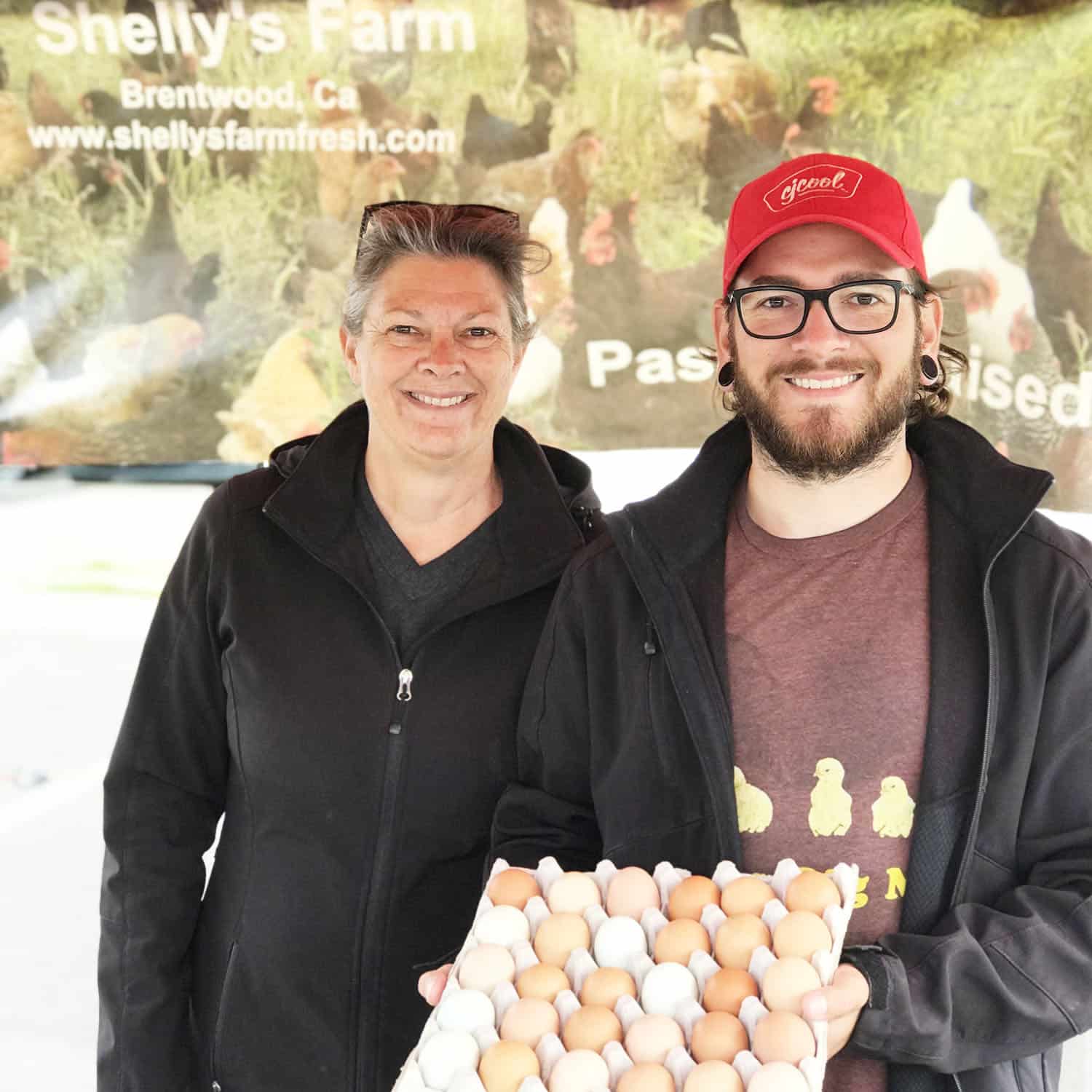In keeping with our #GreetTheGrowers series of spotlights on our Sunday Farmers Market Bay Meadows friends, we’re pleased to introduce you to Shelly and Kelly! Shelly’s Farm Fresh is a small family farm on 10 acres in Brentwood, Contra Costa County where Shelly and her husband planted roots nearly 30 years ago to raise their family, now the family farm raises hens! Kelly, the eldest of Shelly’s 4 sons has become Shelly’s farm-partner and helps her “herd the girls”. What three items would you find if you peeked inside this duo’s Farmers Market bag? Artichokes, Brussel Sprouts and Cilantro, of course! Did you know? To get an eggs best nutrition, you should enjoy the egg in its first 2 weeks! Discover this handy tip and more, read on…