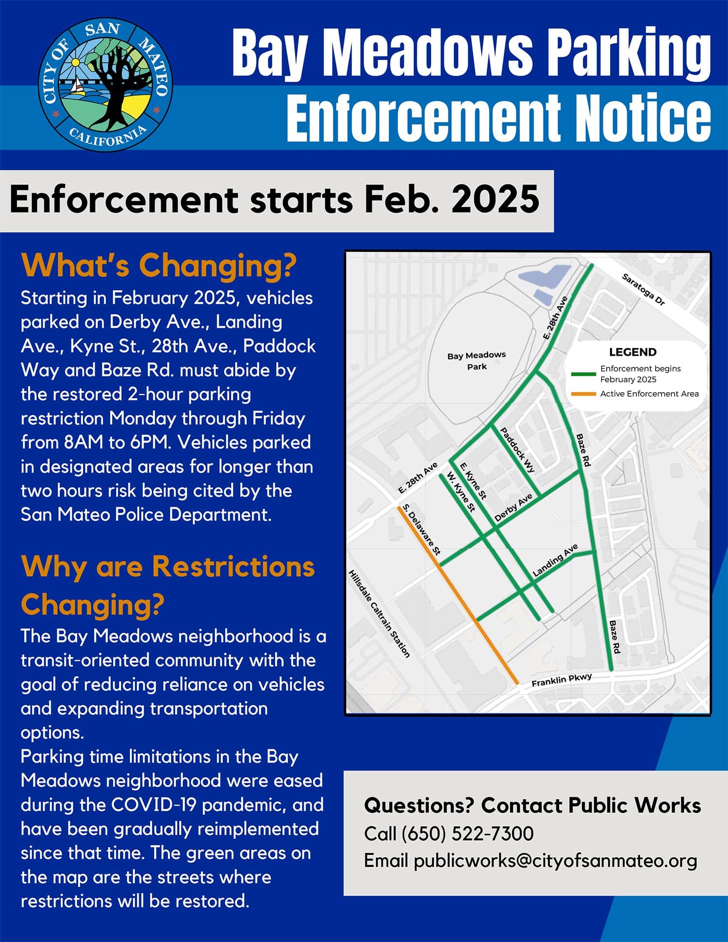 The City of San Mateo recently announced that Bay Meadows parking enforcement is changing this new year.  Starting in February 2025, vehicles parked on Derby Ave., Landing Ave., Kyne St., 28th Ave., Paddock Way and Baze Rd. must abide by the restored 2-hour parking restriction Monday through Saturday from 8:00am to 6:00pm. Vehicles parked in designated areas for longer than two hours risk being cited by the San Mateo Police Department.